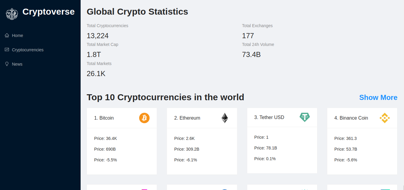 By using a free coin ranking API from rapidAPI.com I created a cryptoverse react App where you can find crypto statistics, like the total exchanges, total cryptocurrencies and much more. Also you can find the latest cryptocurrencies news and the top cryptocurrencies in the world, and you can get access to each cryptocurrency details like the price in USD, Ranking, Number of markets and much more
